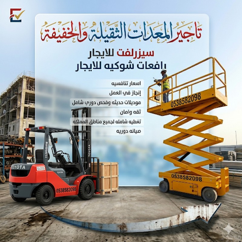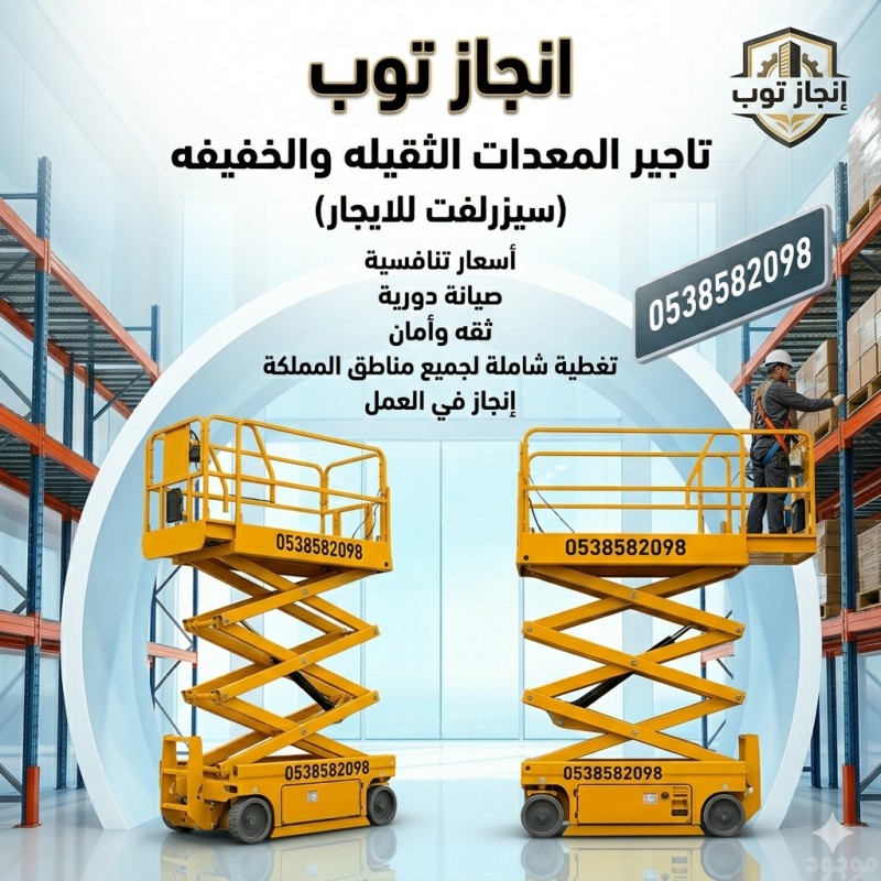 إنجاز توب لتأجير المعدات الثقيلة والخفيفة رافعات شوكية وسيزرلفت جاهزة لمشاريعك اليوم معدات حديثة – صيانة دورية – أسعار منافسة نوفر لك أفضل الحلول لرفع المواد والعمل على الارتفاعات بكل أمان وكفاءة ???? 0538582098