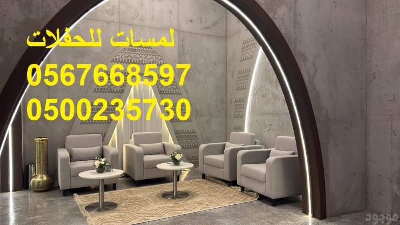 ?مؤسسة لمسات للحفلات تقدم: تجهيز حفلات,تزين قاعات افراح,ايجار جميع انواع المجالس, جلسات ارضيه تاجير طاولات كوكتيل متوفرة بالأنواع : مضيئة , تلبيسة , حديد مع خشب , بللور , تاجير كنب جلد , تاجيرمكيفات خيام متوسطةللايجار, خيام كبيرةللايجار, ايجار كنب ملكي خدمات تنظيم الاحتفالات ,كنب جلد ابيض كراسي فندقية , طاولات طعام وبوفيه , طاولات اجتماعات تزين قاعات,ايجار جميع انواع المجالس, جلسات شالكي الوان مختلفه ايجار خيام,كنب شعبي,ايجار كنب ملكي, ايجار تراثيات تاجير دفايات فيصليه وعاديه وتاجير خيام شفافه وجلسات مودرن تنظيم وتأجير لوازم المناسبات والاحتفالات العامه والخاصه اختار ما يناسبك من الصور للتواصل معنا على الارقام التالية: 8597 766 056 730 235 00 05